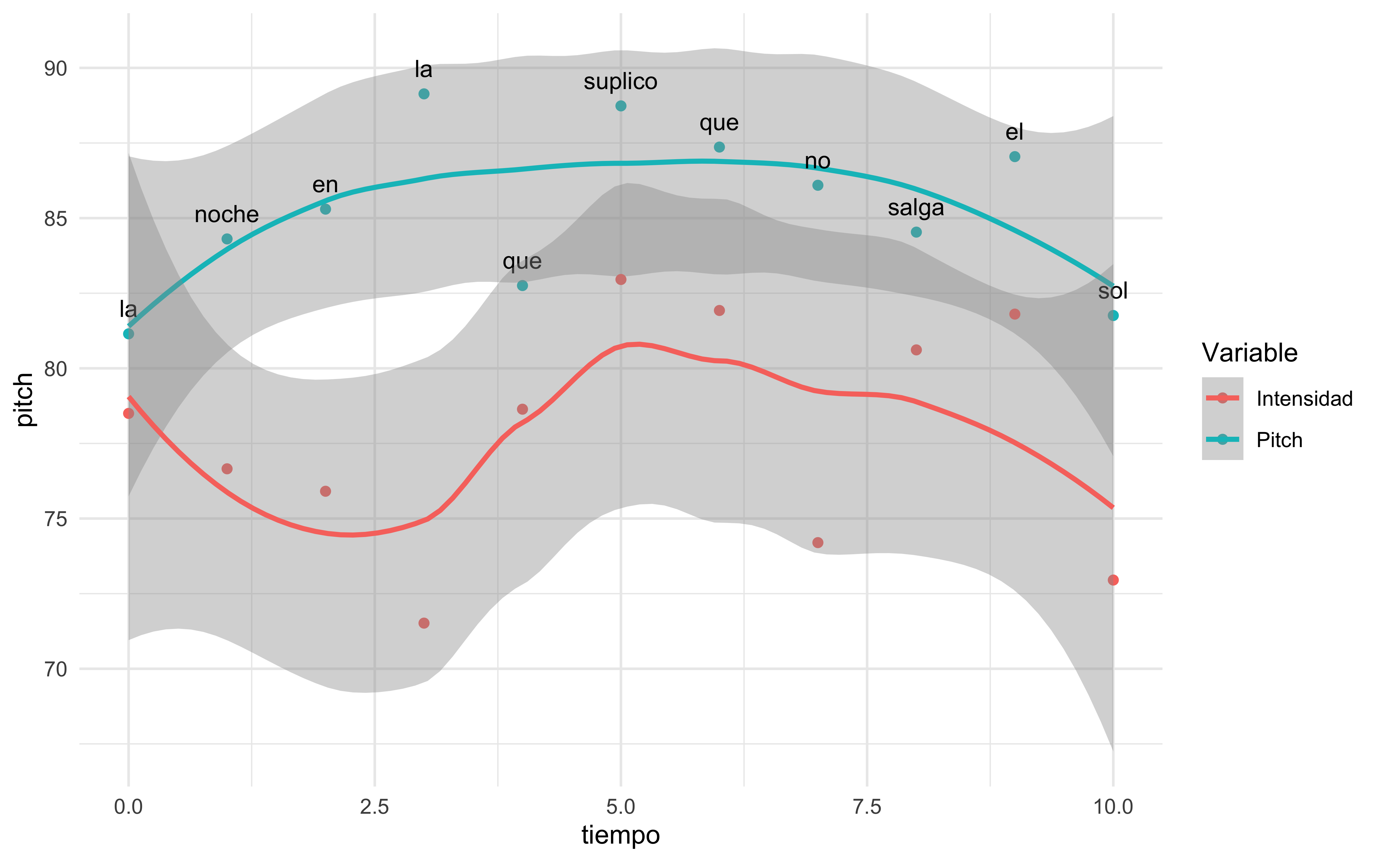 library(tidyverse)library(gridExtra)frase <-unlist(strsplit("la noche en la que suplico que no salga el sol", " "))# Crear el data framedatos <-data.frame(palabra = frase, tiempo =seq(0, length(frase) -1), pitch =runif(length(frase), min=80, max=90), intensidad =runif(length(frase), min=70, max=85) )# Create the plot with labelsplot <-ggplot(datos) +geom_point(aes(x = tiempo, y = pitch, color ="Pitch")) +geom_smooth(aes(x = tiempo, y = pitch, color ="Pitch")) +geom_text(aes(x = tiempo, y = pitch, label = palabra), vjust =-1, hjust =0.5, size =3.5, check_overlap =TRUE) +geom_point(aes(x = tiempo, y = intensidad, color ="Intensidad")) +geom_smooth(aes(x = tiempo, y = intensidad, color ="Intensidad")) +labs(color ="Variable") +# Add text labels above pointstheme_minimal() plot
