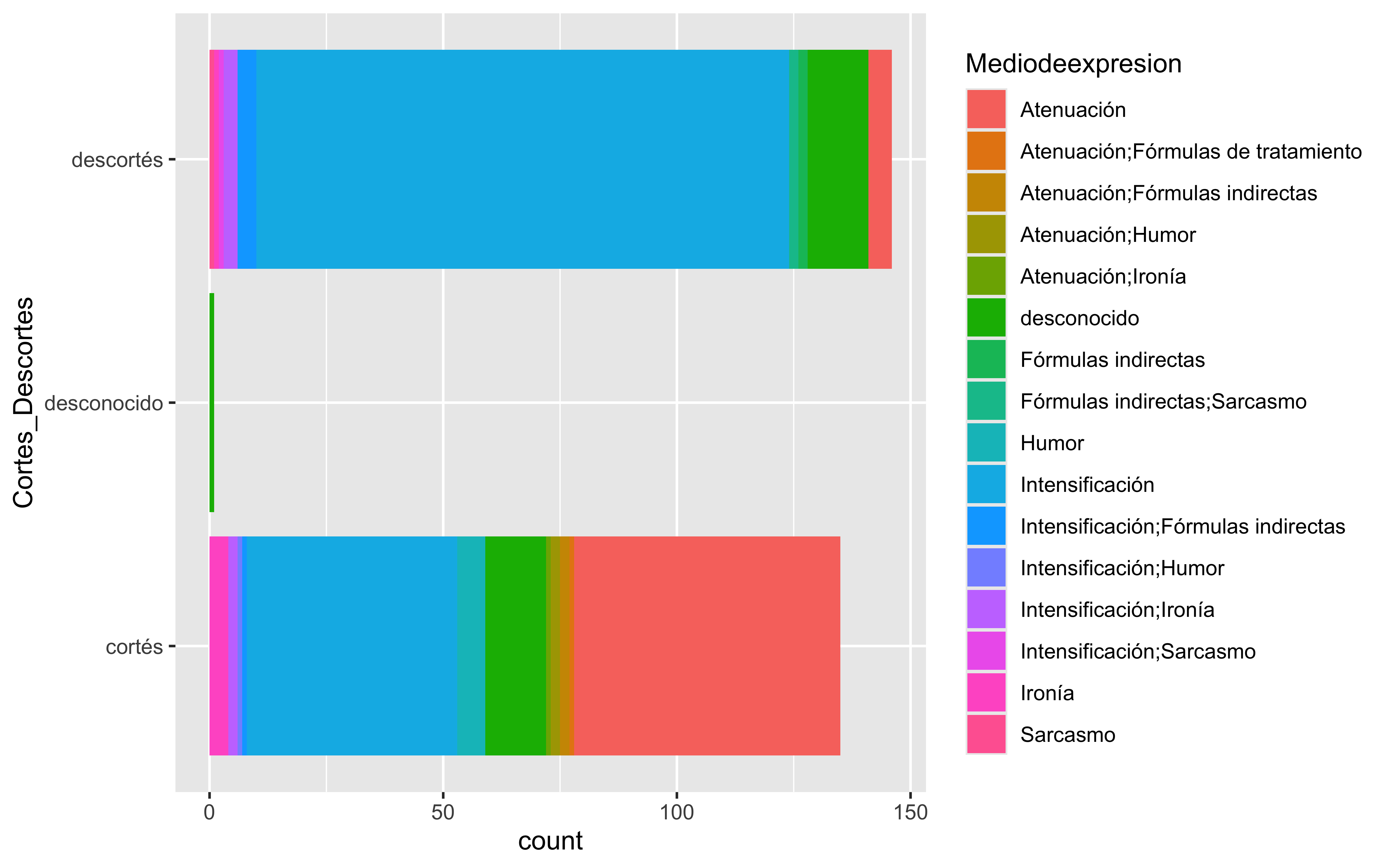 ggplot(data%>%filter(Mediodeexpresion%in%c("Atenuación","Intensificación","desconocido")), aes(x=Cortes_Descortes,y=Percentage, fill=Mediodeexpresion))+geom_bar(stat="identity") +geom_text(aes(label =paste(Total, "(", sprintf("%.1f%%", Percentage), ")", sep ="")),position =position_stack(vjust =0.5), # Center text in the middle of each bar segmentsize =2# Adjust text size ) +coord_flip()