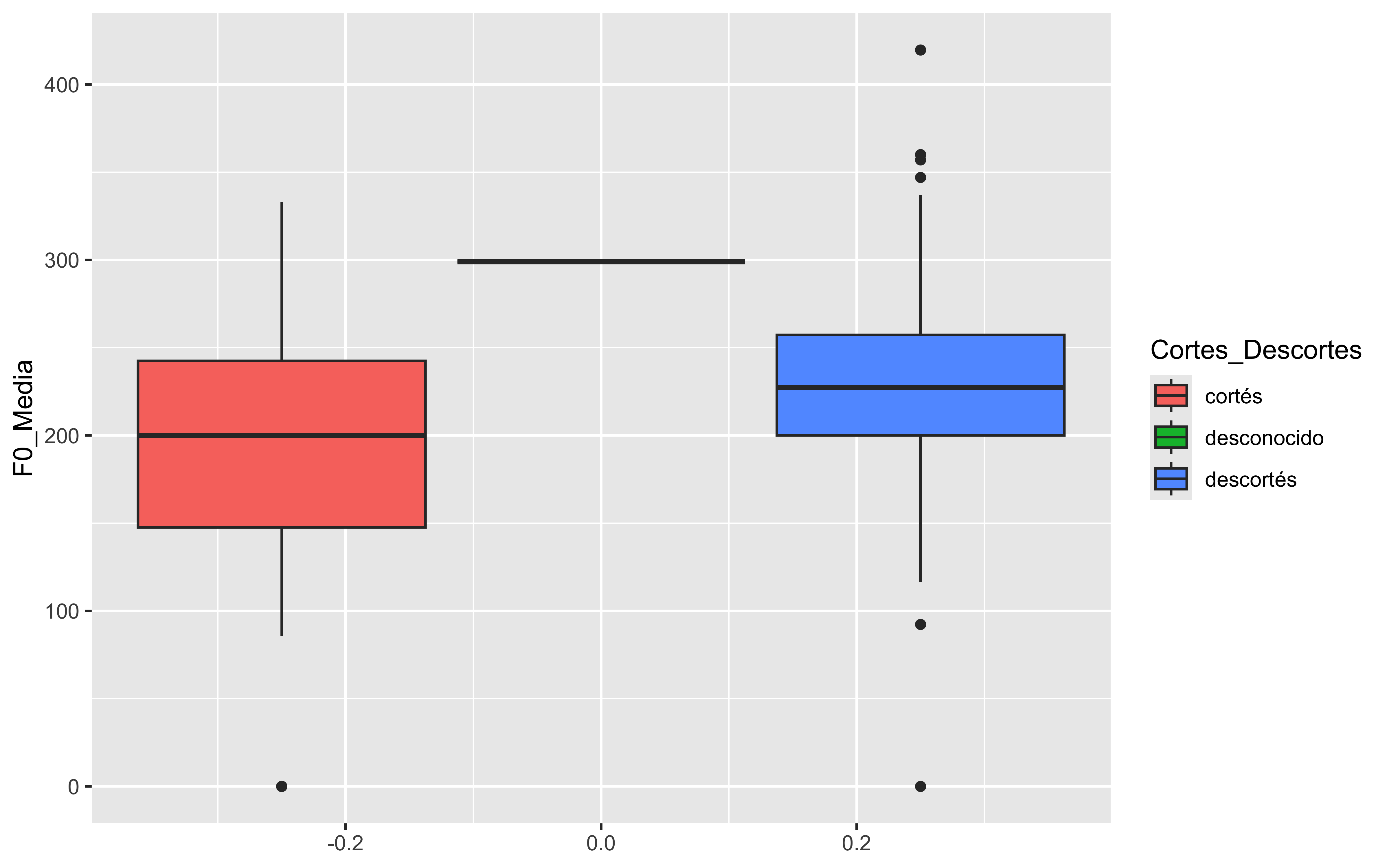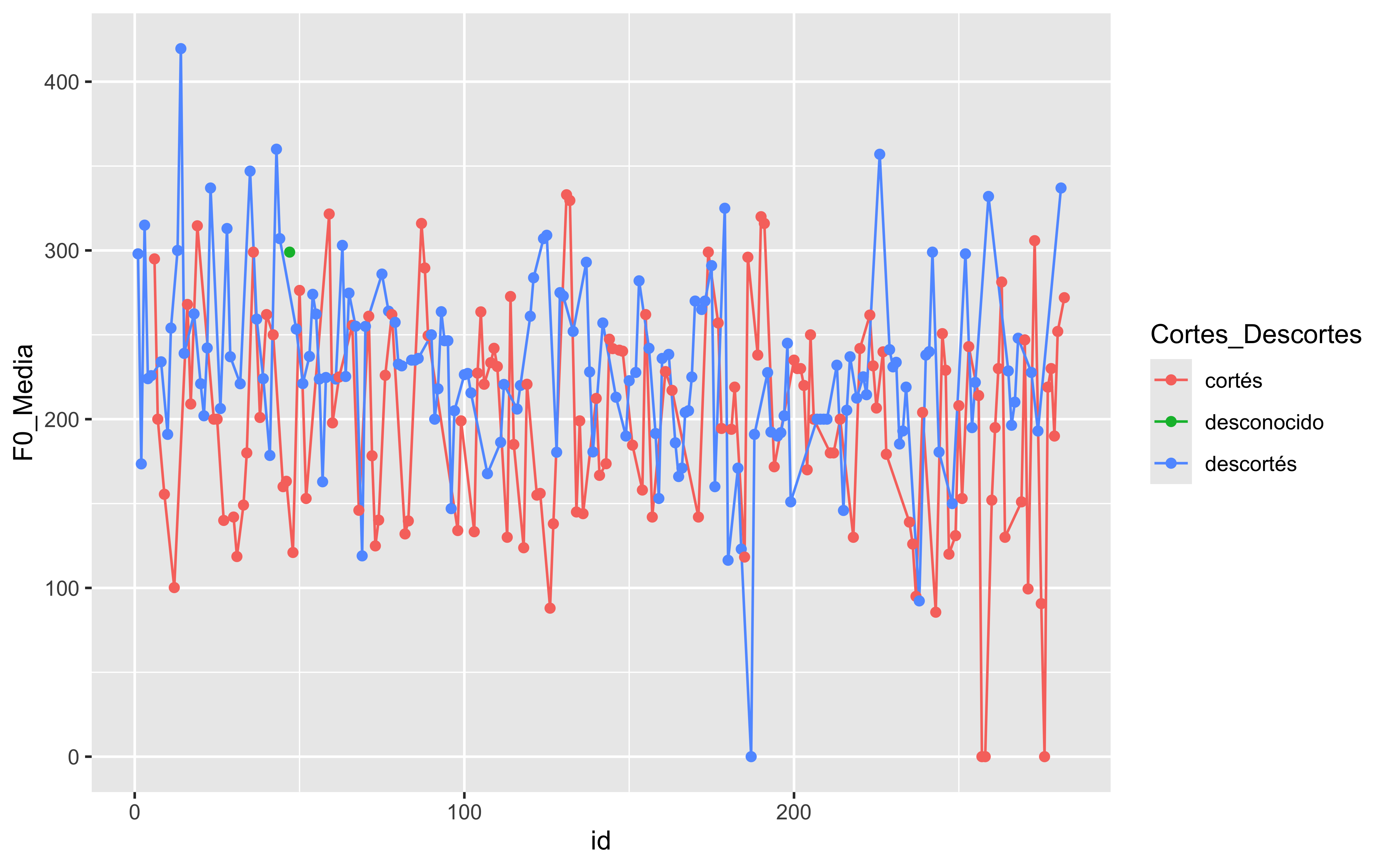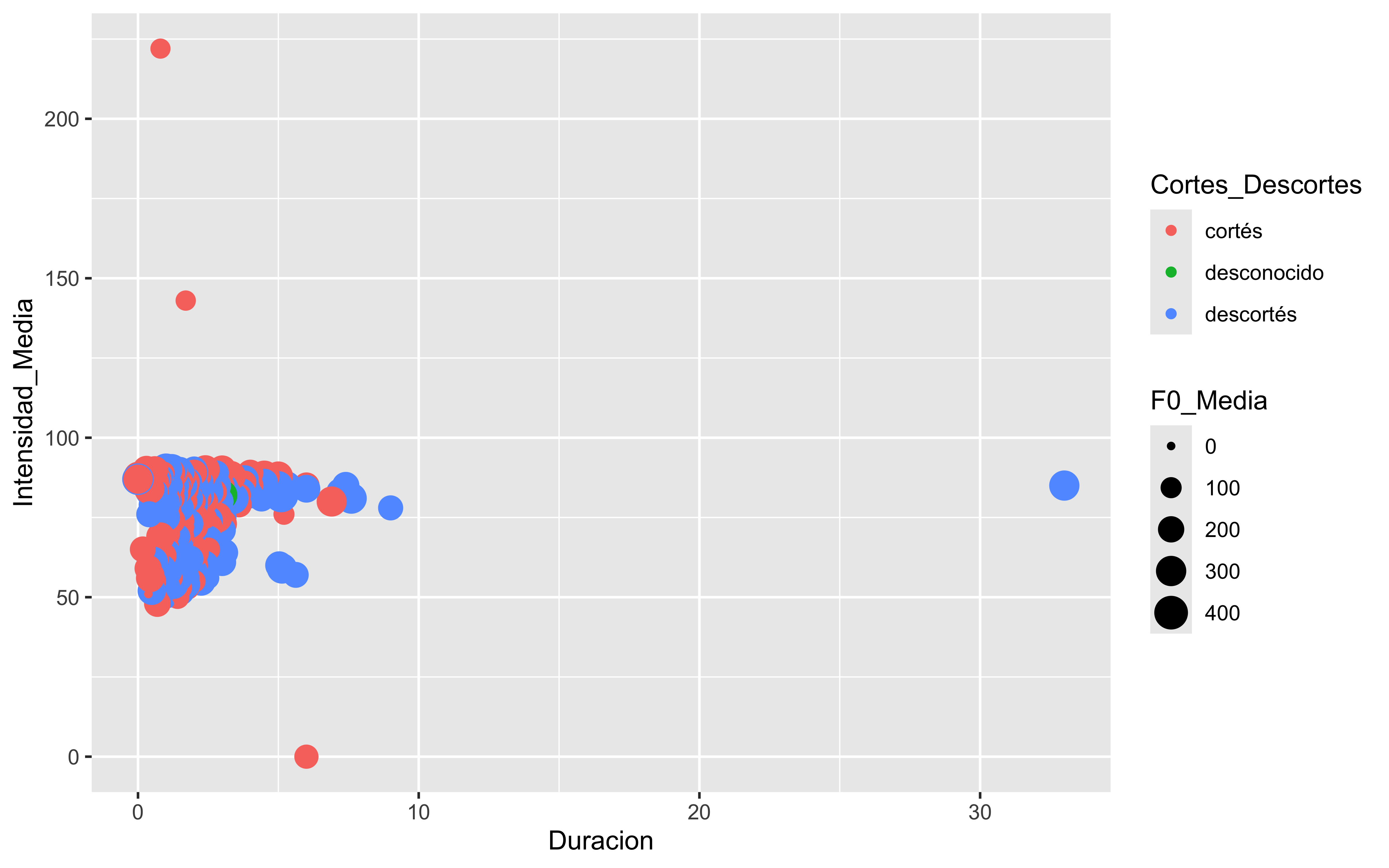 lolipop <- fonocortesia%>%group_by(Cortes_Descortes)%>%summarise(f0_mean=mean(F0_Media,na.rm = T))ggplot(lolipop, aes(x=Cortes_Descortes, y=f0_mean, fill = Cortes_Descortes, color =Cortes_Descortes)) +# Mapear 'z' al tamañogeom_point(aes(size = f0_mean), alpha =0.6) +# Añadir puntos de dispersión con transparenciageom_segment(aes(x=Cortes_Descortes, xend=Cortes_Descortes, y=0, yend=f0_mean)) +coord_flip()