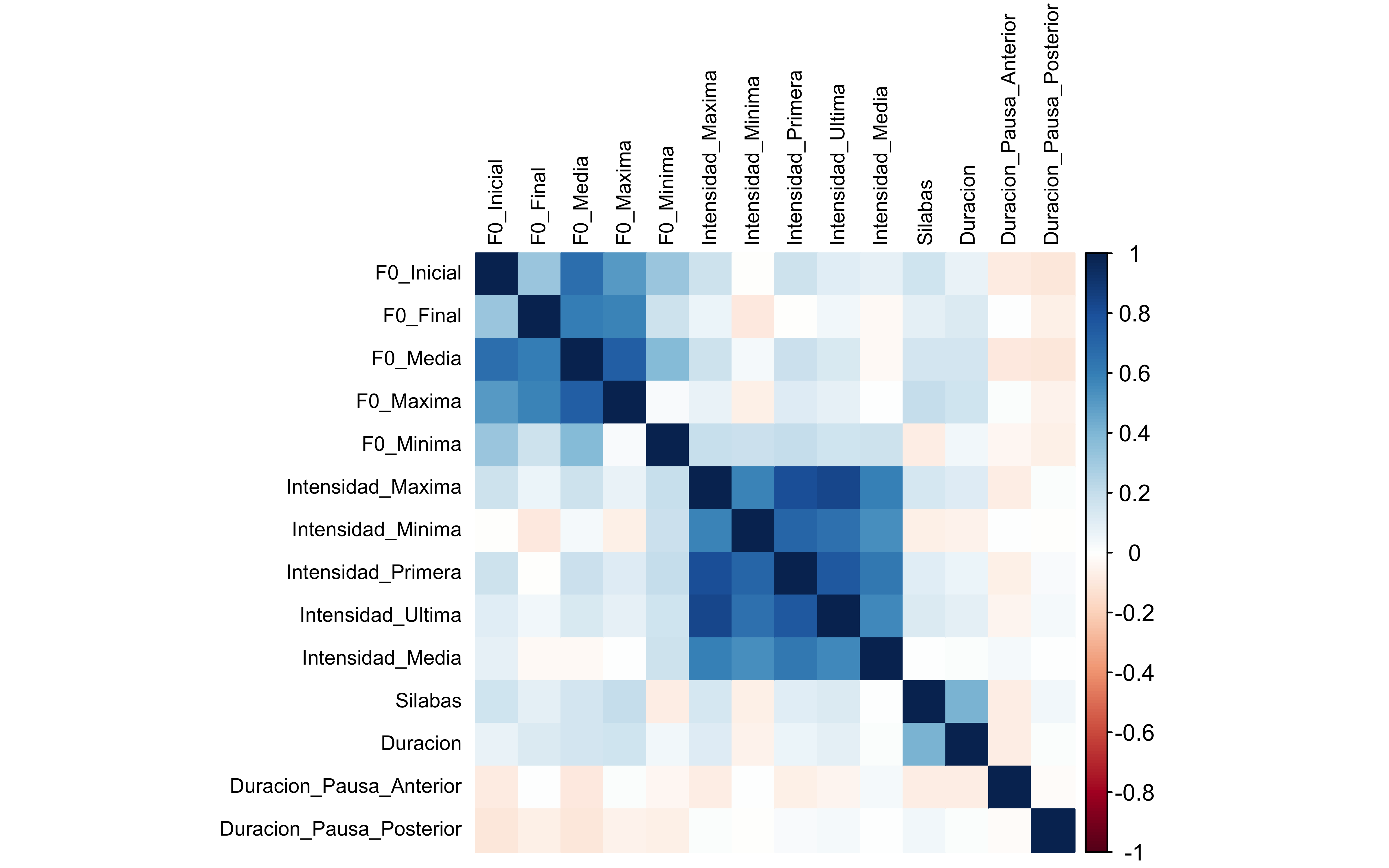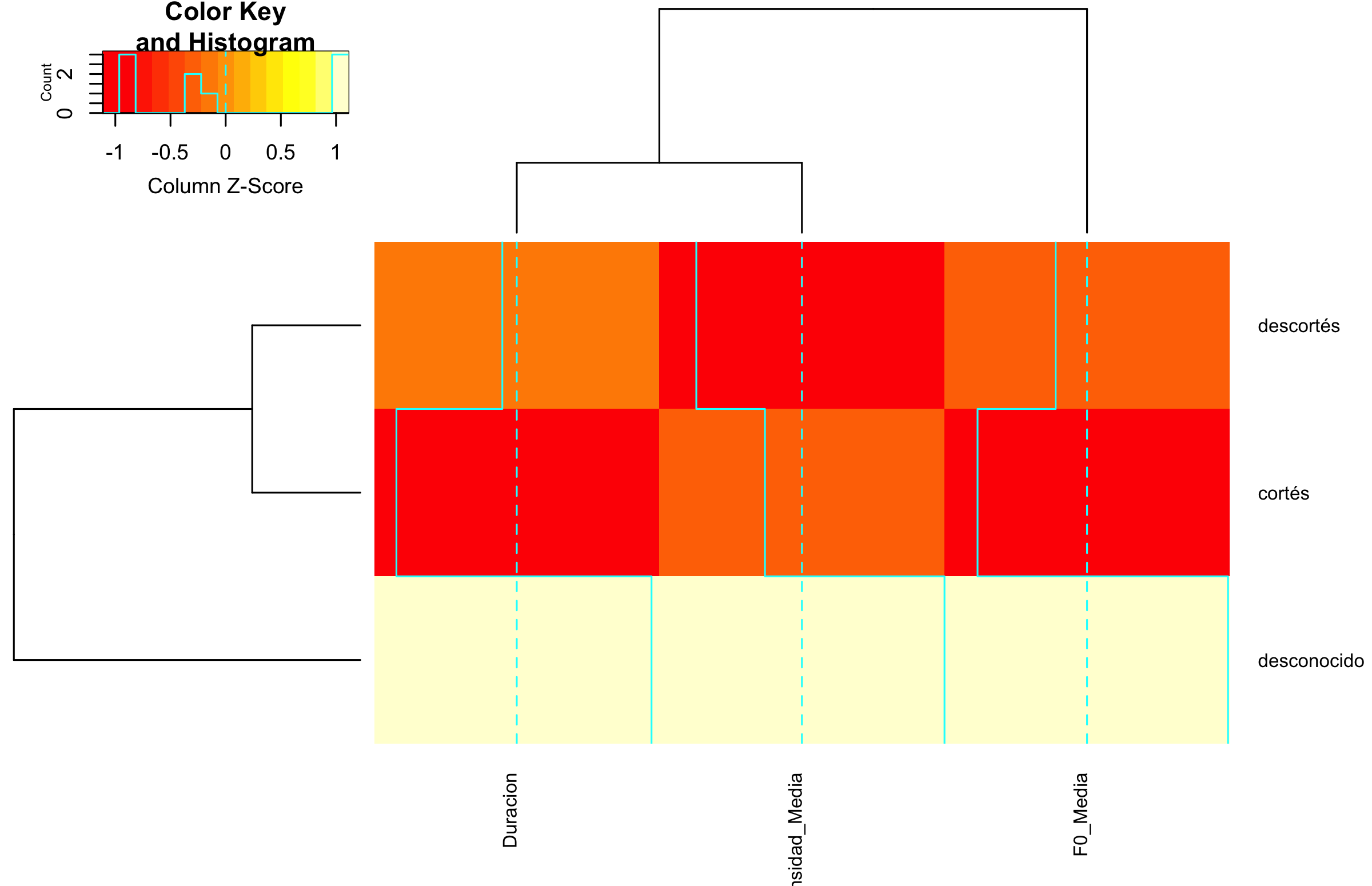 library(gplots)png(filename='heatmap.png', width=2400, height=1550, res=300)# Ajustar márgenespar(mar=c(5,4,4,2) +0.1)# Cargar datos y procesarlosp <- fonocortesia %>%group_by(Cortes_Descortes) %>%summarise_all(mean, na.rm =TRUE) %>%column_to_rownames(var="Cortes_Descortes") %>%select_if(is.numeric) %>%select(F0_Media, Duracion, Intensidad_Media)# Generar el heatmapheatmap.2(as.matrix(p), na.rm =TRUE, scale="column", cexCol =0.8, cexRow =0.8)# Cerrar el dispositivo gráficodev.off()