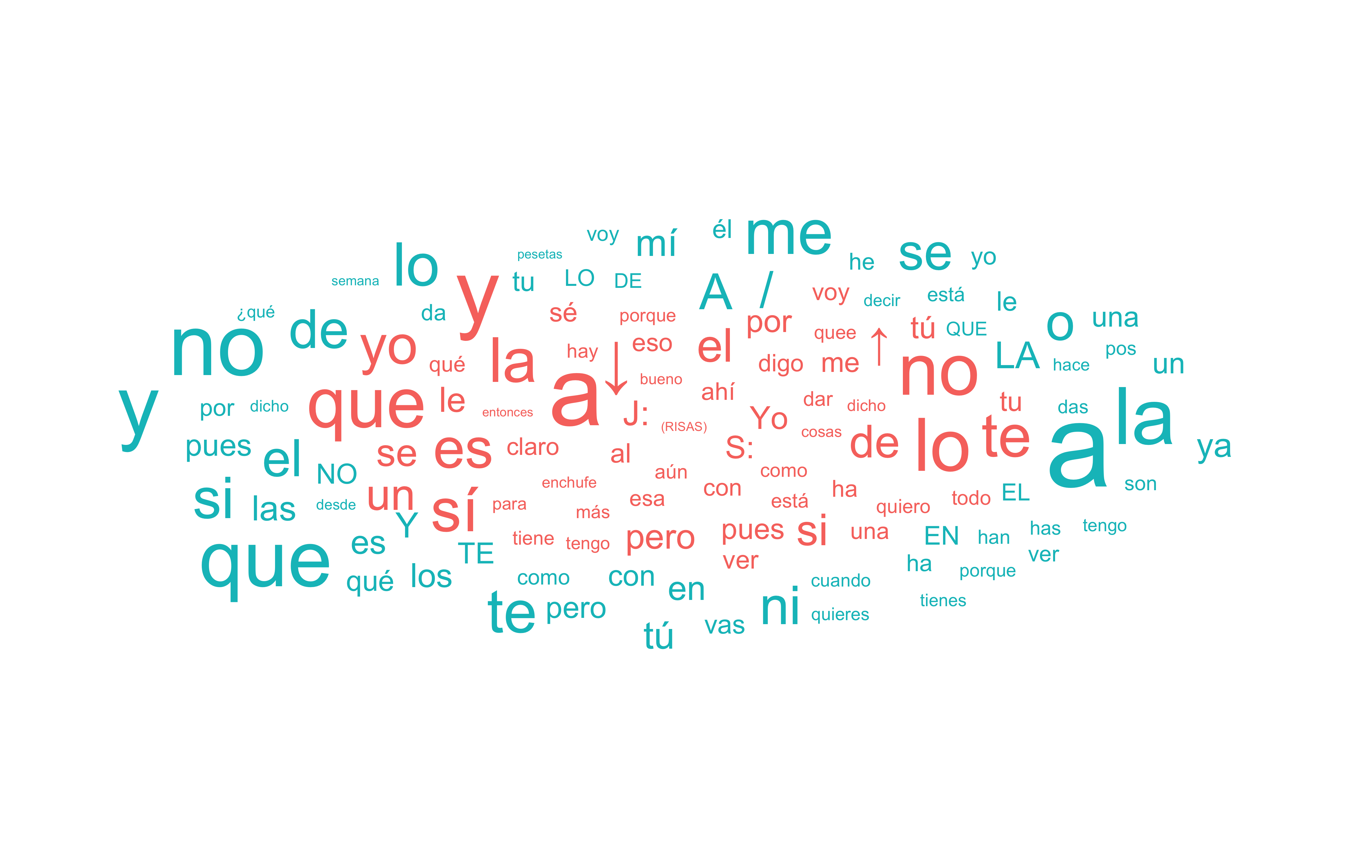 library(ggwordcloud)df_words <- fonocortesia %>%select(Cortes_Descortes,Elemento_Analizado)%>%mutate(word =str_split(Elemento_Analizado, " "),cortesia=Cortes_Descortes) %>%# Dividir el texto en palabrasunnest(word) %>%group_by(cortesia,word) %>%summarise(frecuencia =n())%>%filter(frecuencia>2) ggplot(df_words%>%filter(!word%in%c("A:","B:","C:","L:","M:","(...)")), aes(label = word, size = frecuencia,color=cortesia)) +geom_text_wordcloud(area_corr =TRUE) +scale_size_area(max_size =20) +theme_minimal()
