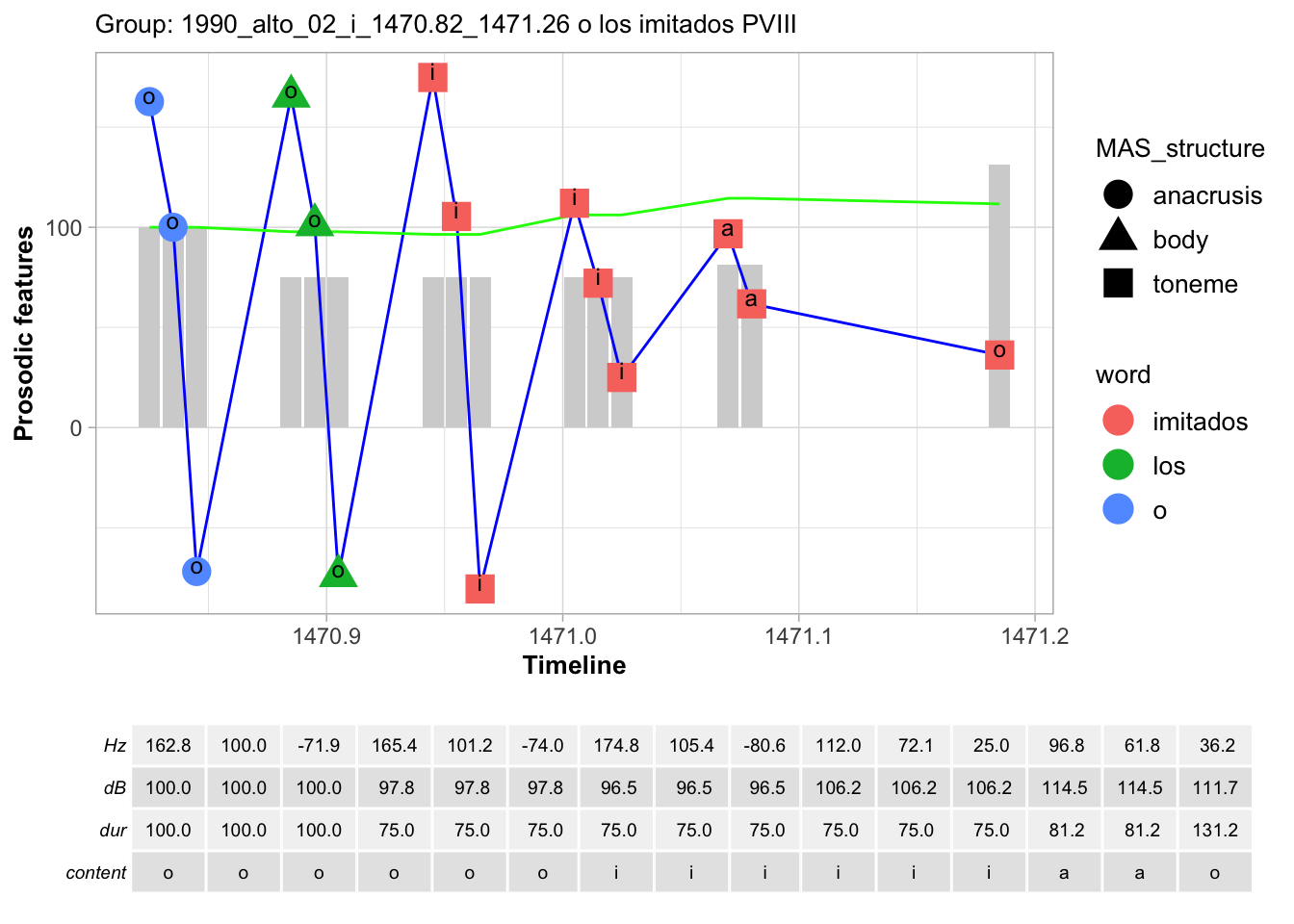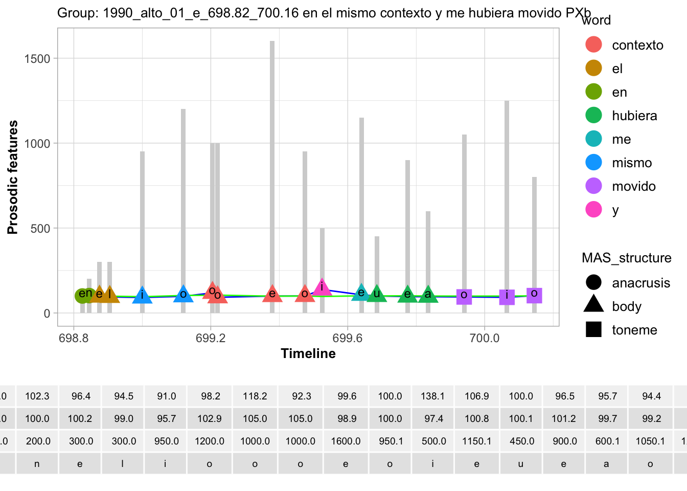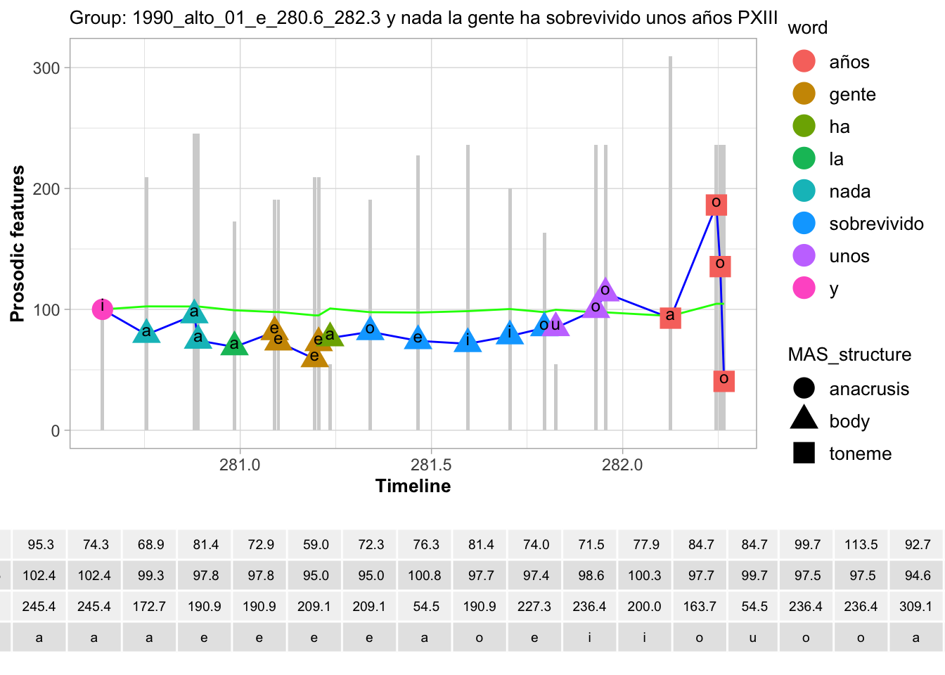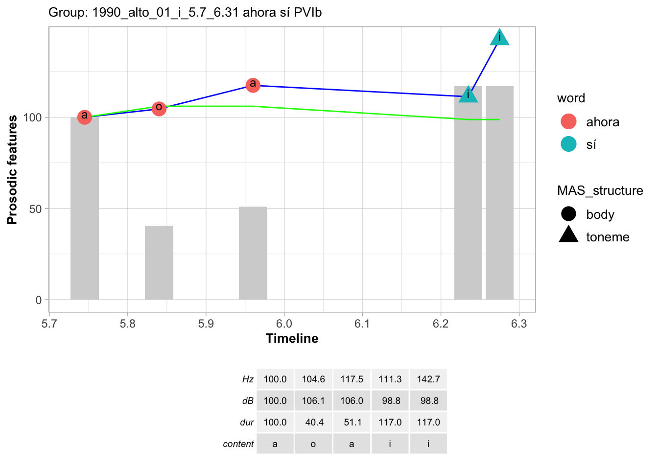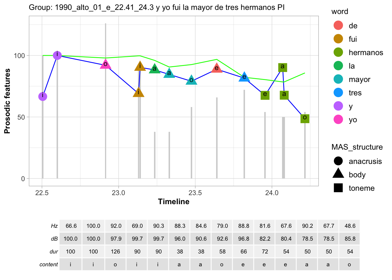 (b) provides the prosodic information for all of them, like pitch range, mean and median, intensity mean, or duration, for intonational phrases, and