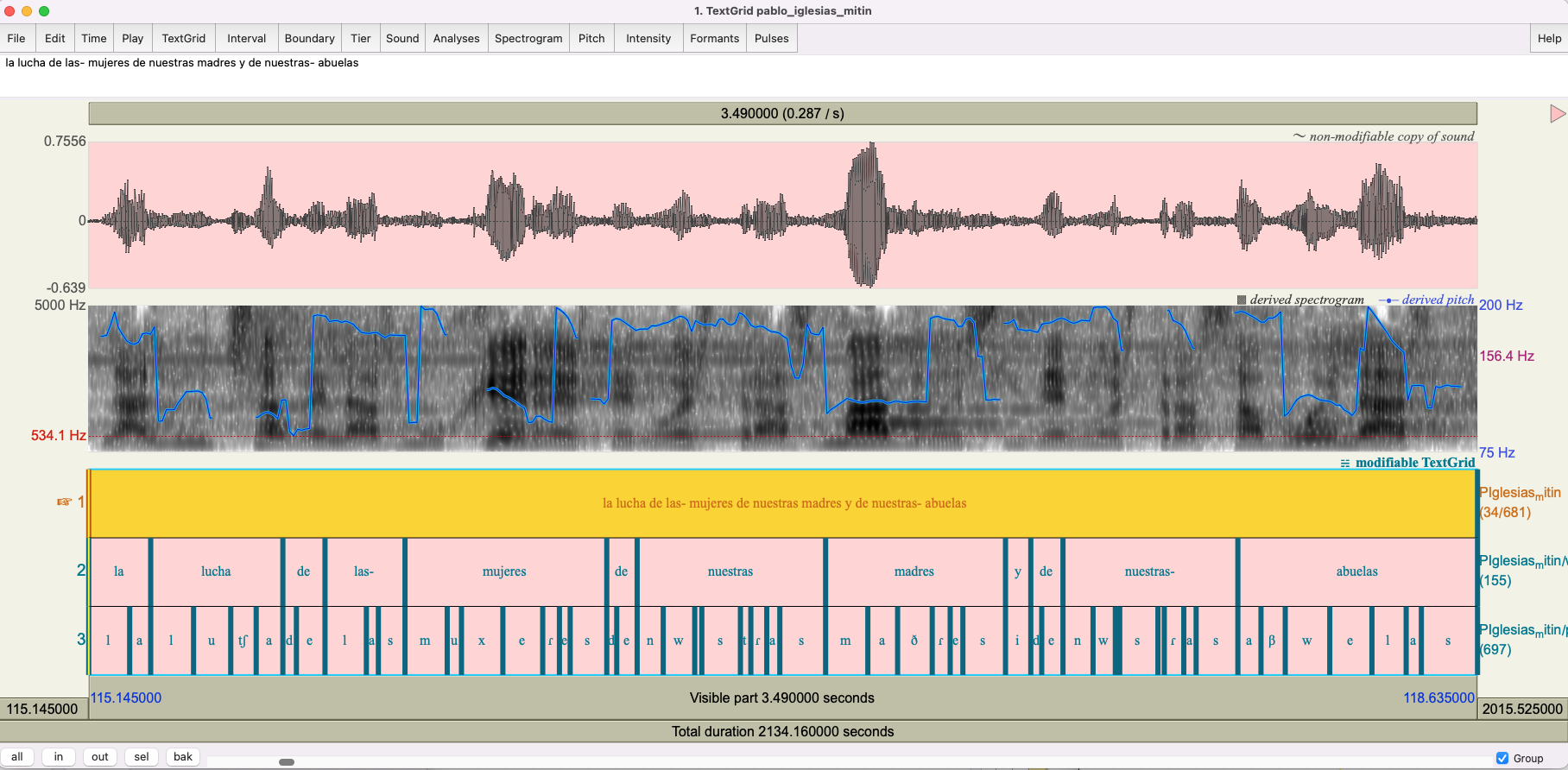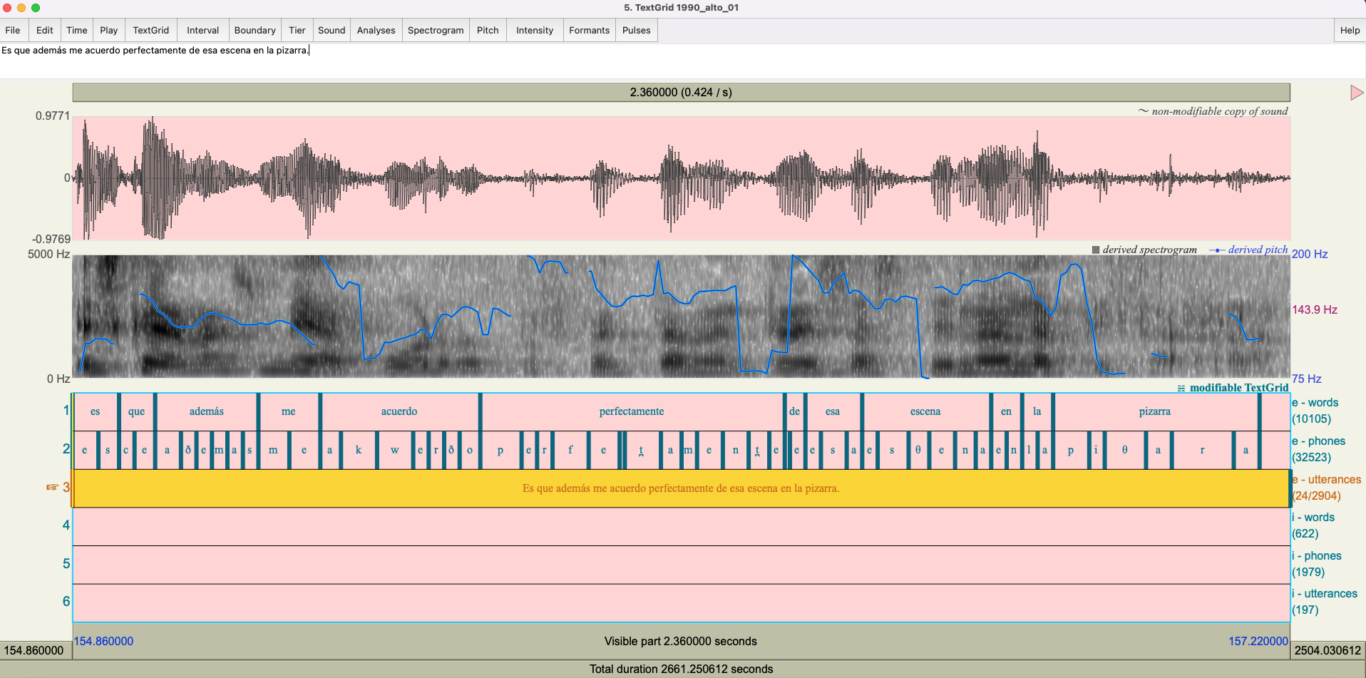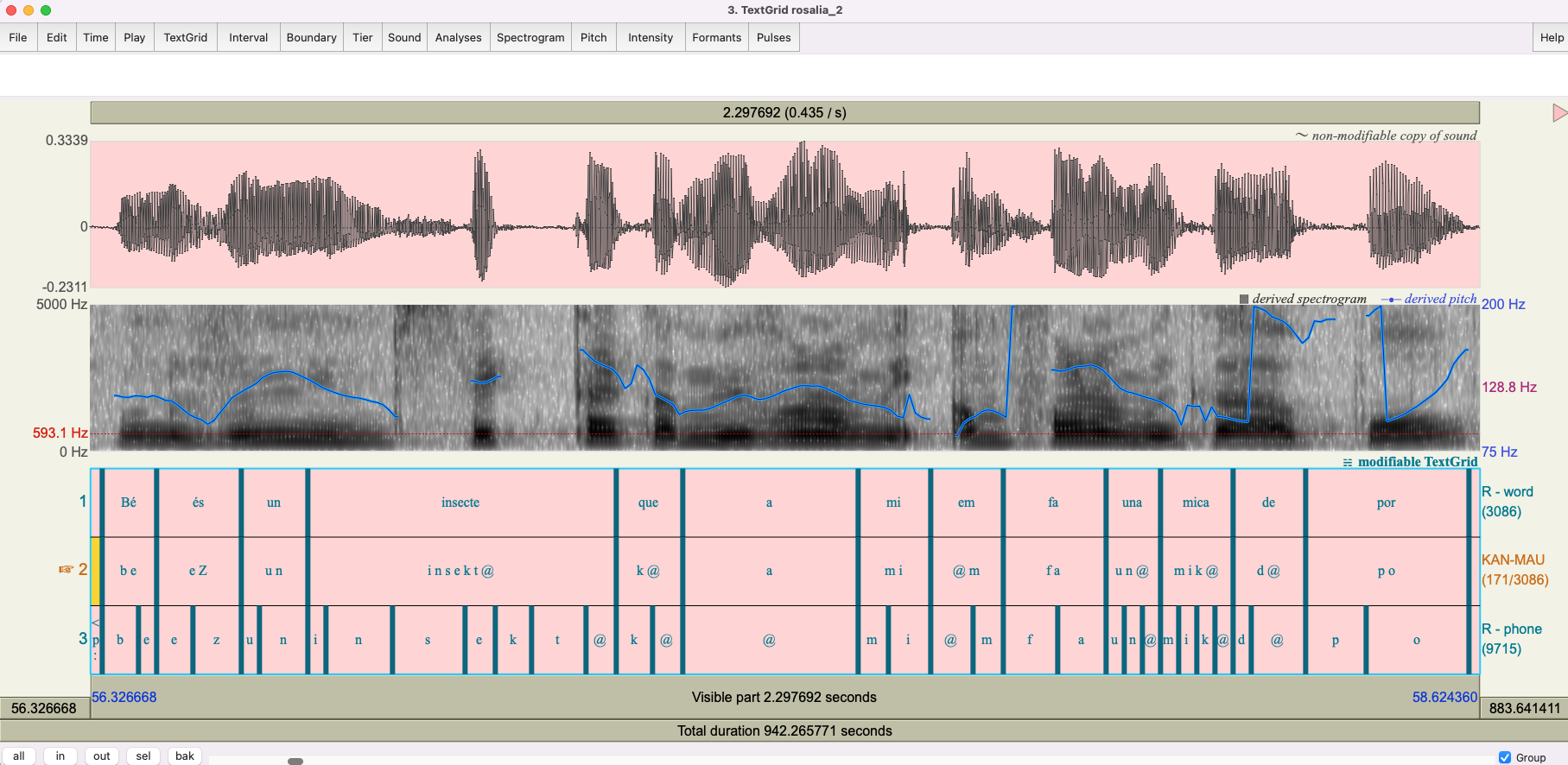For example, if you’re working with a TextGrid file from the Catalan folder containing an interview with Rosalia, you might encounter tier names such as “R - word” and “R - phone”. Since this TextGrid originates from WebMaus, there may not be an “utterance” tier.