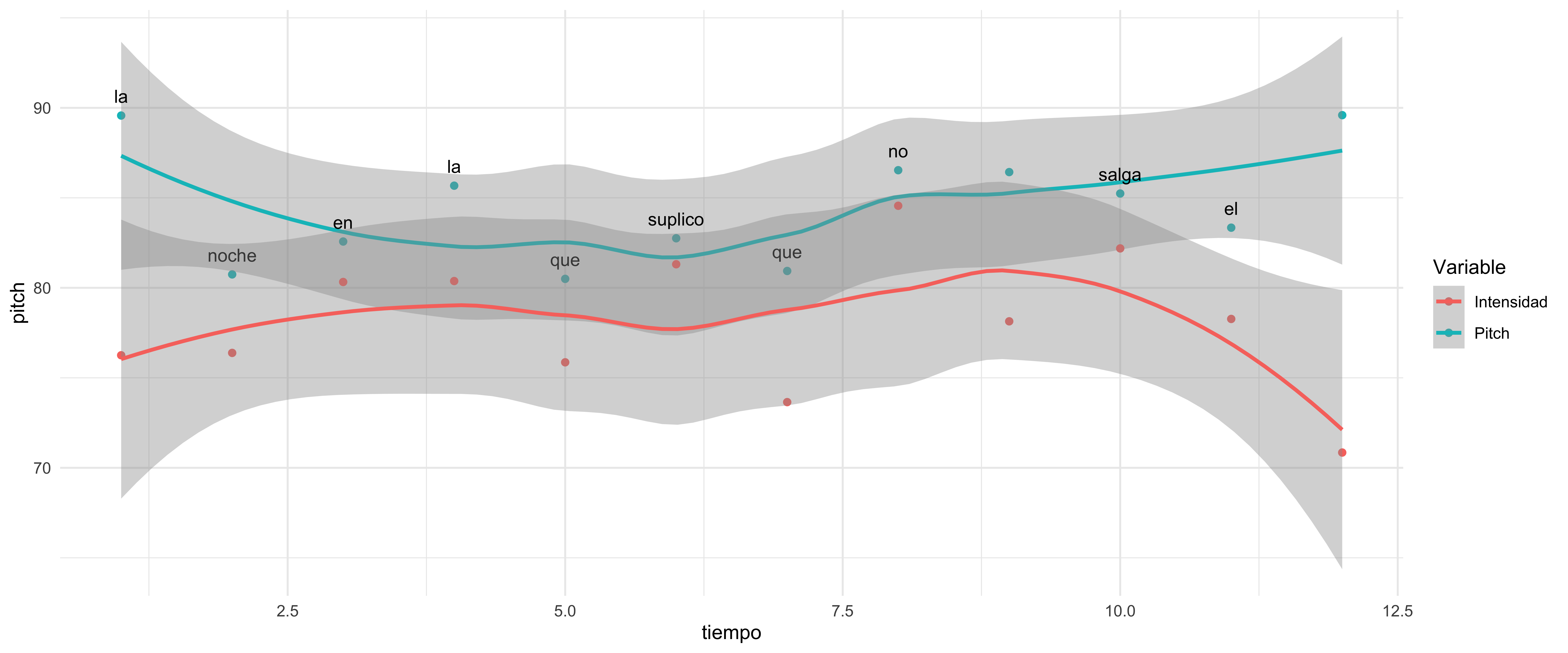 Figura extraída con GGplot2. Curva melódica y de intensidad del enunciado la noche en la que no salga el sol