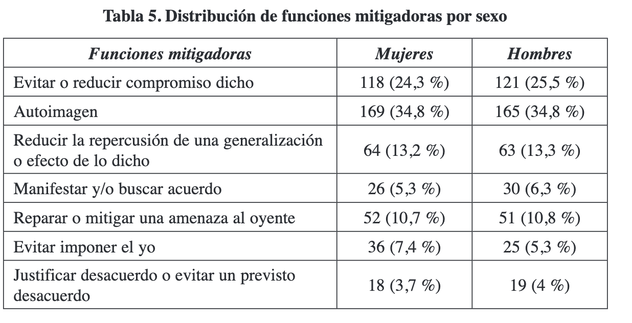 Fuente: Albelda Marco, Marta. «Variación sociolingüística de los mecanismos mitigadores: diferencias de uso en edad y sexo». Cultura, lenguaje y representación: revista de estudios culturales de la Universitat Jaume I, 2018, Vol. 19, pp. 7-29, https://raco.cat/index.php/CLR/article/view/355769.
