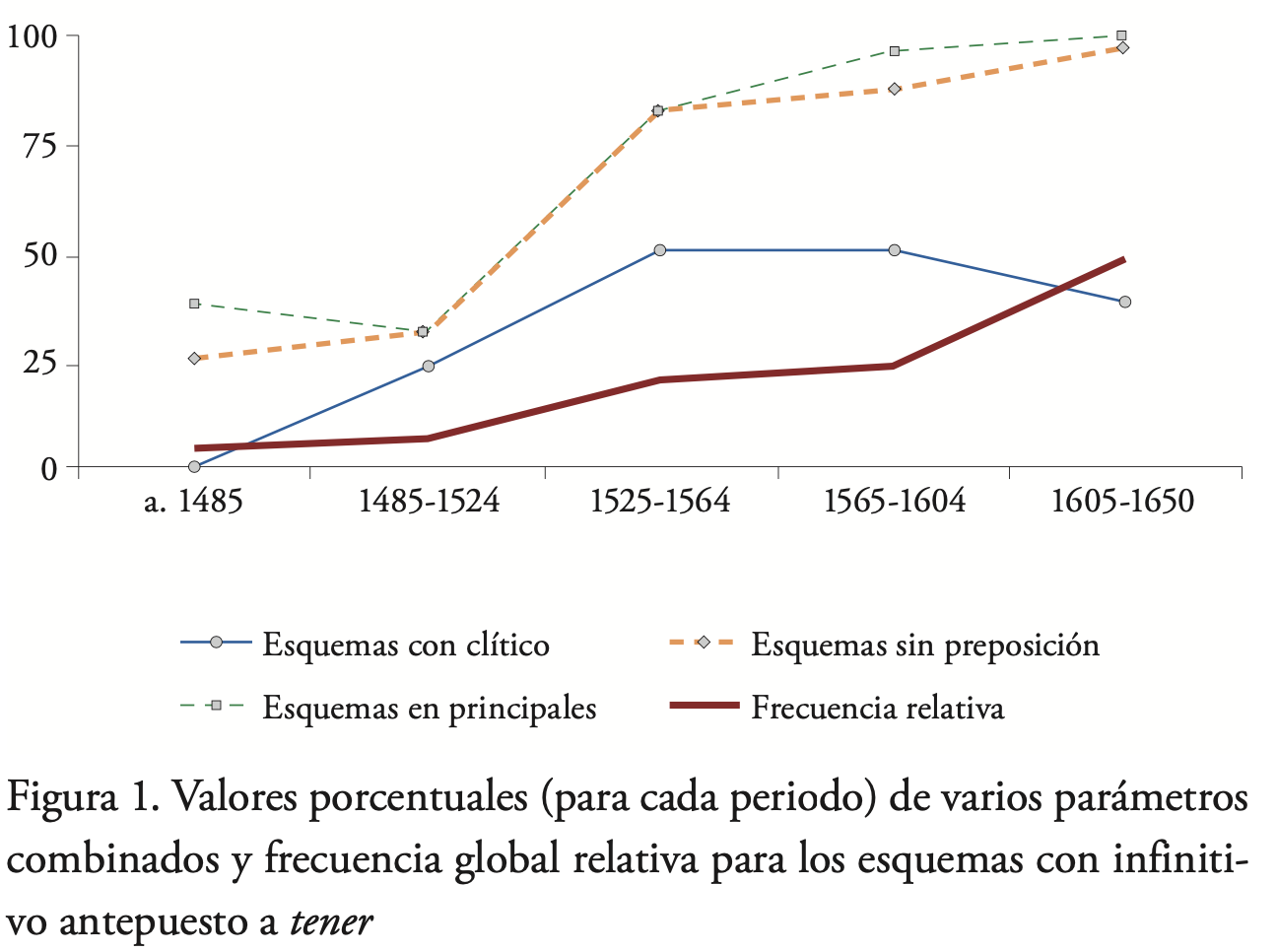 Fuente: de Toledo y Huerta, Á. S. O. (2016). Enseñanzas del cambio fracasado: Trayectoria y estela de una perífrasis fugaz (infinitivo + tener). Cuadernos de Lingüística de El Colegio de México, 3(1), 119. https://doi.org/10.24201/clecm.v3i1.28