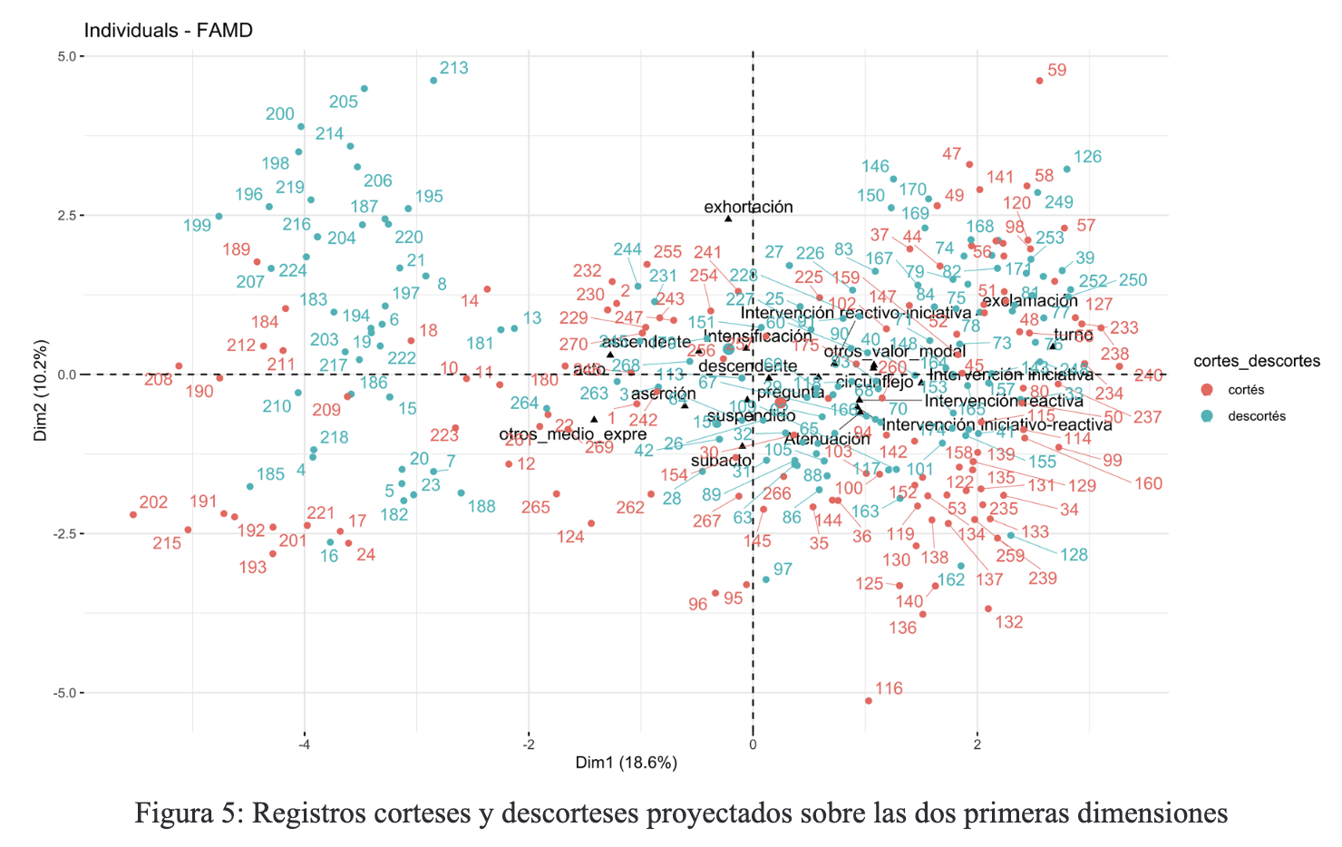 Imagen en la que se distribuyen enunciados corteses y descorteses según sus dimensiones fónicas. Método de visualización estadística utilizada: FAMD (análisis factorial de datos múltiples).